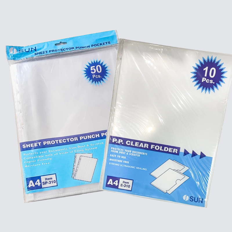The Sun Sheet Protector Punch Pockets are designed for multi-purpose filing and protection of important documents. They are clear, anti-static, and multi-punched to fit standard ring binders or lever arch files.